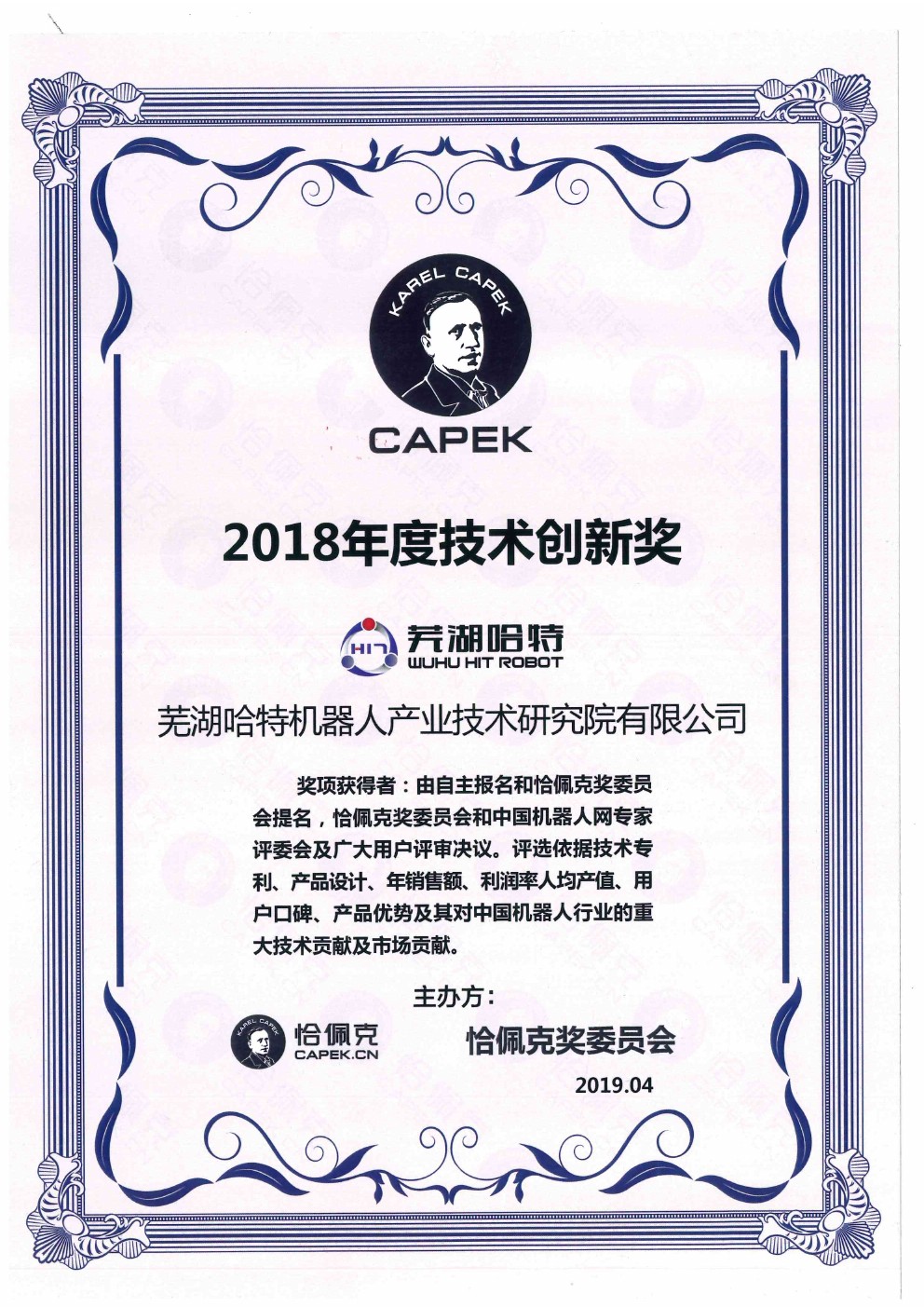 恰佩克獎(jiǎng)(The Capek Prize), 是以捷克科幻小說(shuō)家, robot 一詞創(chuàng)造者卡雷爾·恰佩克(KarelCapek)名字命名的獎(jiǎng)項(xiàng),創(chuàng)立于2014年,致力于做機(jī)器人行業(yè)發(fā)展的見(jiàn)證者,打造機(jī)器人行業(yè)的“諾貝爾”。該獎(jiǎng)項(xiàng)的設(shè)立,旨在對(duì)機(jī)器人行業(yè)中具有戰(zhàn)略遠(yuǎn)見(jiàn)的領(lǐng)導(dǎo)型企業(yè)做標(biāo)桿定位,拉升產(chǎn)業(yè)品牌整體格局;對(duì)行業(yè)中具有創(chuàng)新能力的企業(yè)做典范推介,提升產(chǎn)業(yè)整體創(chuàng)新能力;對(duì)積極推進(jìn) 行業(yè)發(fā)展的個(gè)人做嘉獎(jiǎng),肯定其為行業(yè)發(fā)展所做的貢獻(xiàn)。目前在中國(guó)范圍內(nèi)恰佩克獎(jiǎng)通常被認(rèn)為是機(jī)器人領(lǐng)域內(nèi)至高無(wú)上的獎(jiǎng)項(xiàng)。