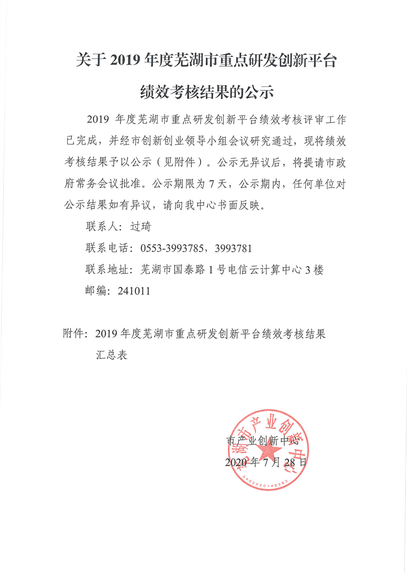 哈特研究院在2019年蕪湖市重點研發(fā)創(chuàng)新平臺績效考核中榮獲“優(yōu)秀”等級