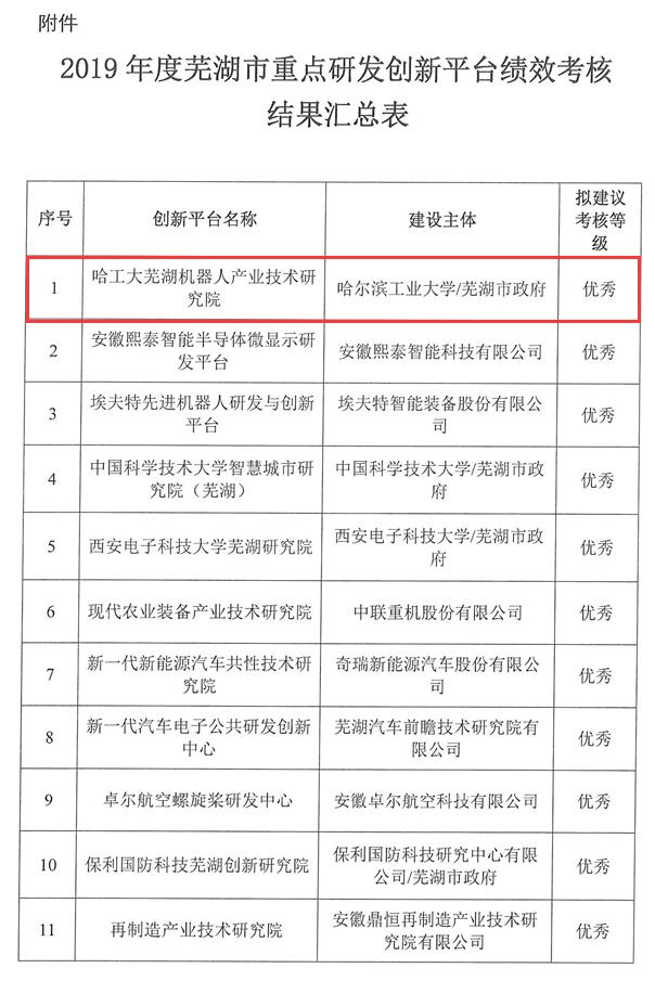 近期,市產(chǎn)業(yè)創(chuàng)新中心會同市科技局、市發(fā)改委、市財政局根據(jù)《蕪湖市重大公共研發(fā)平臺運營管理與績效考核辦法(試行)》(蕪政辦〔2018〕34號)等相關文件精神,對全市35個重點研發(fā)創(chuàng)新平臺進行了2019年度績效考核,其中,哈工大蕪湖機器人產(chǎn)業(yè)技術研究院在考核中榮獲全市“優(yōu)秀”等級。