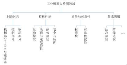根據(jù)GB/T 12642-2013《工業(yè)機(jī)器人 性能規(guī)范及其試驗(yàn)方法》及ISO 10218-1-2011《機(jī)器人和機(jī)器人裝置--工業(yè)機(jī)器人安全要求--第1部分:機(jī)器人》等一系列關(guān)于工業(yè)機(jī)器人性能試驗(yàn)與環(huán)境安全的標(biāo)準(zhǔn)要求,結(jié)合主流工業(yè)機(jī)器人產(chǎn)品特征和應(yīng)用特點(diǎn),列舉出當(dāng)前工業(yè)機(jī)器人性能檢測(cè)與試驗(yàn)的主要領(lǐng)域,如下圖: