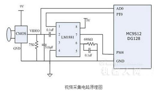 由于單片機A/D速度限制,需要選用低分辨率的黑白攝像頭。因為低分辨率意味著視頻單行掃描時間的增加,而黑白攝像頭意味著只需要單路A/D就可以完成視頻采集工作。選擇了Omvision生產(chǎn)的ov5116芯片為內(nèi)核的CMOS黑白攝像頭,分辨率為320×240,圖像刷新頻率50Hz。同時選用LM1881視頻同步信號分離芯片提取視頻信號中的行同步和場同步信號,連入s12的脈沖捕捉通道。通過捕捉信號觸發(fā)AD模塊工作,采集存儲視頻數(shù)據(jù)。