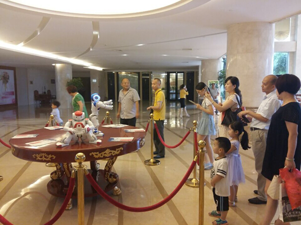 6月28日,我司迎賓機(jī)器人、送餐機(jī)器人和NAO機(jī)器人在蕪湖陽光半島大酒店精彩亮相,作為蕪湖市五星級(jí)酒店首家機(jī)器人自助餐廳,吸引了不少顧客前來酒店觀看機(jī)器人表演和就餐,特別是放了暑假的孩子們和陪同的家長(zhǎng)。