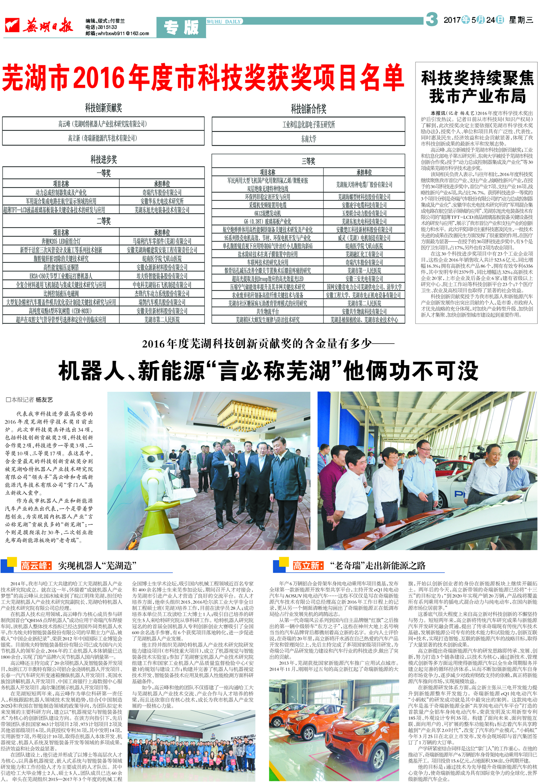 2017年5月24日,蕪湖日報以整版方式公布了蕪湖市2016年度科技獎名單,蕪湖哈特機器人產(chǎn)業(yè)技術(shù)研究院總經(jīng)理高云峰喜獲蕪湖市科技大獎——科技創(chuàng)新貢獻(xiàn)獎!蕪湖日報同時以《高云峰:實現(xiàn)機器人蕪湖造》為題,介紹了高總在蕪湖市機器人產(chǎn)業(yè)集聚發(fā)展過程中所做的貢獻(xiàn)和取得的成績。