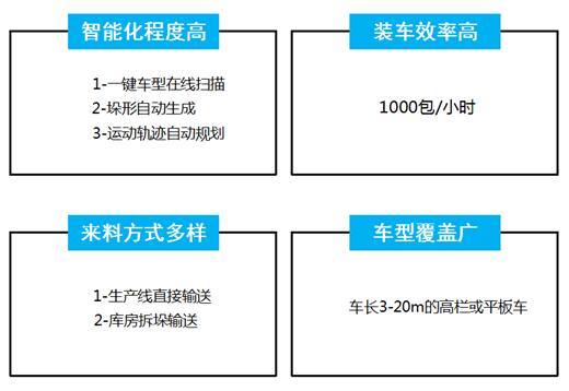 同人工裝車相比,裝車效果優(yōu)良,空間利用率最大化,垛型設計最優(yōu)化。